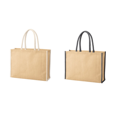 ざっくりとしたジュート素材にアクセントカラーが映える、自然素材の風合い豊かな大きめトートバッグです。大容量のLサイズは肩掛けもでき、柔らかいパイプハンドルの持ち手で使い心地も抜群。ノベルティの他、販売用のオリジナルグッズにもおすすめです。オリジナルプリントで新商品にいかがでしょうか。持ち手が短めのMサイズもございます。