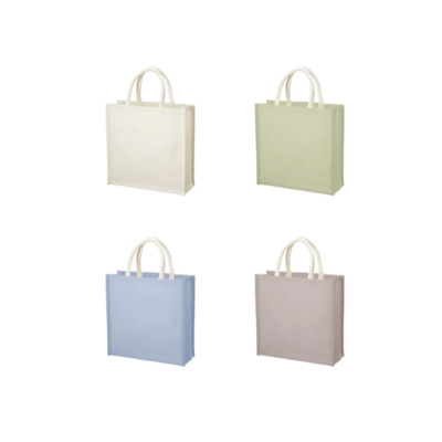 ジュートはしっかりした生地なので、物をたくさんいれてもバッグのシルエットを保ちやすいのが特徴です。ビーンズトートはスクエア型でマチが広めなこともあり、シルエットを保ったまま自立収納可能になっています。直置きしてディスプレイできるので、物販用オリジナルグッズとしてもオススメです。