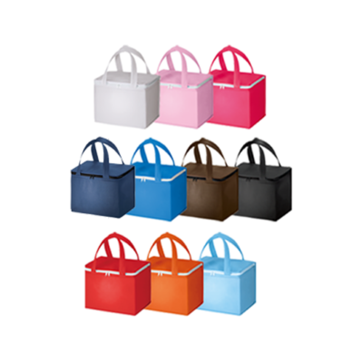 不織布素材の保冷・保温機能付きのボックス型のトートバッグです。500ml缶が6本入るサイズです。内側がアルミ蒸着フィルムが施してありますので、不織布ながらもしっかりとした雰囲気です。天面と正面の2か所に印刷が可能です。カラーバリエーションは10色ございます。販促・ノベルティなどにとても人気です。