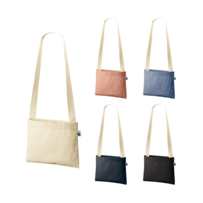 フェアトレードコットンを使用した横長のシンプルなシンプルサコッシュです。10オンスとしっかりとした厚みを備え、袋口にはホックボタンがついています。横長の形状はメインバッグとしても、A4サイズがきれいに収まります。国際フェアトレード認証ラベル付きのアイテムとなっており、SDGsやサスティナブルへの取り組みで企業価値を高められます。
