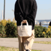こちらのトートバッグは、船底タイプの底マチなので、大きめのお弁当箱を横にせず「平置き」可能なサイズ感になっています。ミニサイズでも容量が大きめなので、お散歩などのお出かけや仕事中の貴重品入れとしてもお使い頂けます。