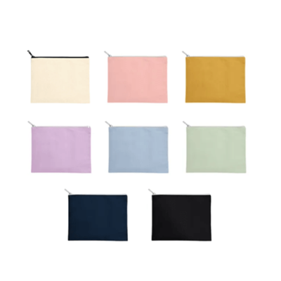 コットン素材のマチなしフラットポーチです。3サイズがあり、真ん中のスタンダードなサイズで、一番人気があります。開口部はジッパーになっております。カラーバリエーションは3色。マチなしなので名入れ範囲が広く、オリジナルプリントが映えます。ポーチはノベルティなどにも最適なアイテムで大ロットなどにも向いています。
