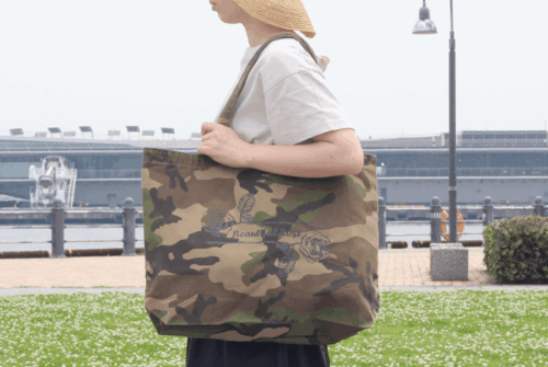 迷彩柄(カモフラパターン)の厚手コットン素材で作った大きめサイズの船底タイプのエコバッグです。ベーシックなかたちですが、迷彩生地をつかった特徴のある大きめエコバッグです。サイズ違いの一回り小さいMサイズ、さらに小さいランチバッグタイプもご用意しています。