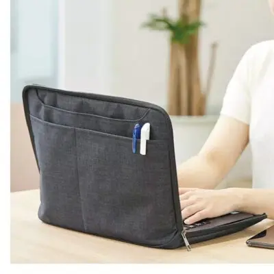 持ち手出し入れできるハンドル付きのPCケースです。ファスナーを開ければそのままPC操作ができるのが嬉しい。外側にはポケットがあり、アダプタやマウス、スマートフォンやノート、ペンなどの収納もできます。バッグひとつでリモートワークの必需品をすべて収納、持ち運びができちゃう万能バッグ。加工箇所が3カ所あり、フルカラー印刷も可能です。高級ノベルティとしてはもちろん、オリジナルグッズとしてもおすすめです。