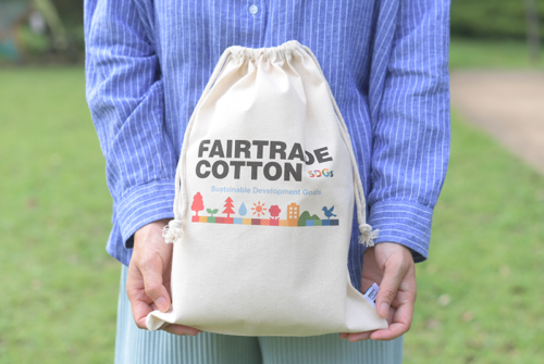 薄手のフェアトレードコットンを使用したシンプルなサイズの大きめ巾着です。国際フェアトレード認証ラベル付きのアイテムとなっており、SDGsやサスティナブルへの取り組みで企業価値を高められます。 ノベルティや販促としてとても注目のアイテムのひとつです。
