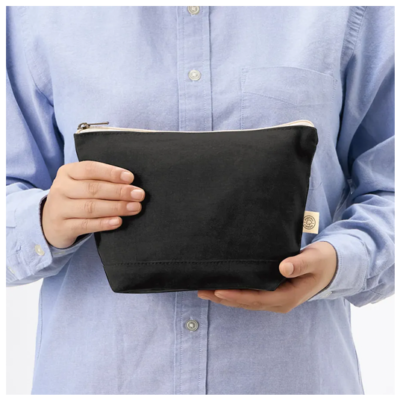 船底タイプのややおおきめポーチです。底面にマチがあるので、お化粧品や小物入れなど、普段使いに便利な人気のある仕様になっています。環境に優しいオーガニックコットンを使用しています。定番のタイプはこちらの大きめサイズと、他小ぶりなミニサイズの2サイズでご用意しております。