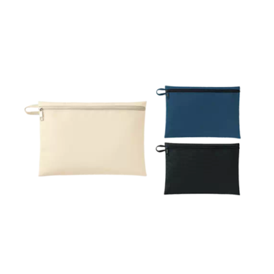ポリエステル素材でつくった、フラットタイプの大きめサイズのポーチです。ベーシックなシンプルなポーチです。ストラップがついているのでとても便利!汚れにくく、タフな素材のポリエステルは、メイク用品や文具をいれるのに最適です。カラーバリエーションは3色ございます。