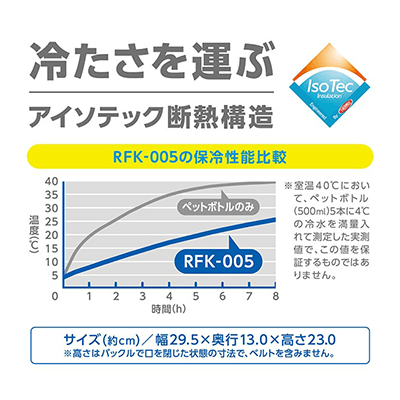 袋口を折り返してバックルを留めるだけのロールトップ型のサーモス(THERMOS)の保冷バッグです。複数の材質を組み合わせたアイソテックの断熱構造が冷たさをキープしてくれます。内生地は汚れをふき取りやすい生地(PEVA)を使用しています。500~600mlのペットボトルが縦に5本入るサイズ感で、スポーツやアウトドアシーン、通勤通学時のサブバッグとしてもぴったりの保冷バッグです。