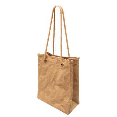 耐水性・耐久性の高い特徴をもつウォッシャブルペーパーで作られたミニバッグ。持ち手はロープ紐になっており、ロープを通している穴はハトメ加工になっています。500mlペットボトルもすっぽりと収まるサイズ感でマチが10cmと広めになっているため、ちょっとした買い物やお出かけにぴったりのトートバッグです。販売用や贈答品など他とは違うトートバッグの作成を考えている方におすすめです。